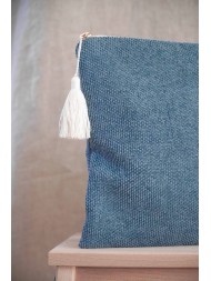 Funda de portátil/Ipad/tablet realizada completamente a medida con el tejido chenilla tono azul marino beige y borlón de algodón.Protección total del ordenador contra golpes con guata interior.