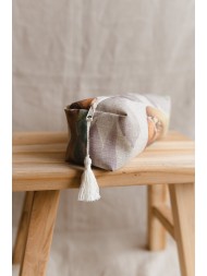Estuche fabricado con el tejido de lino estampado loros y borlón de algodón.