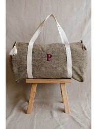 Bolsa de viaje fabricada con tejido chenilla tono marrón empolvado. Correas de algodón en tono marfil. Cremallera de acero inoxidable dorado y borlón de algodón. Bolsillo interior del mismo tejido exterior.