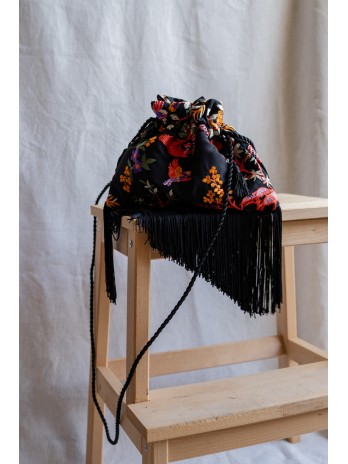 Bolso fabricado con tela de seda color negro y flores bordadas combinadas. Bajo de flecos negros y lazos negros para abrir y cerrar. Bolsillo en el interior.
